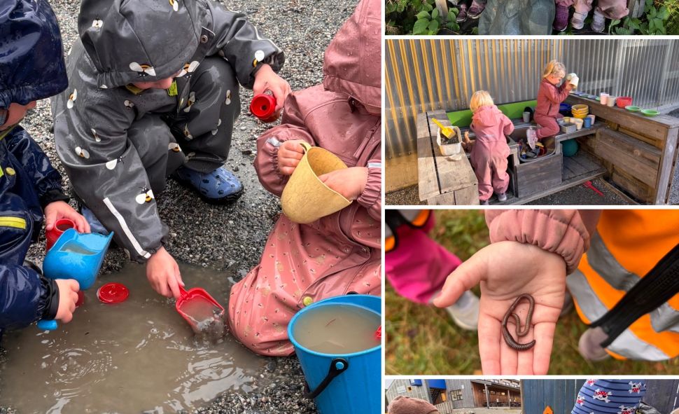 Hvis grashoppene får valget mellom å leika ute eller inne så velger dei veldig ofte å gå ut. Dei trenger plass til å utfolde seg, plass til å springe og større rom til å utforske i. Vatn og sølepyttar er veldig kjekt, og her finner vi masse kjekk leik.